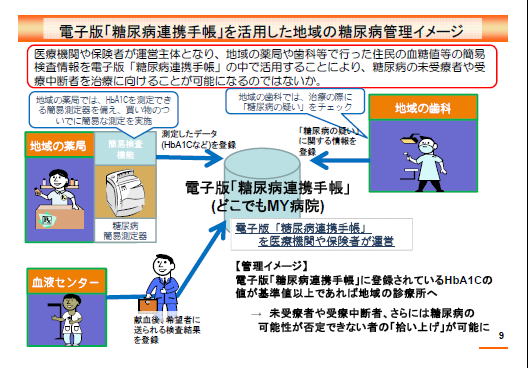 会合の様子はほとんど報じられていないので、資料を見て想像するしかないのですが、医療機関に対するメリットがはっきりとしている調剤情報をベースとした電子版「お薬手帳」を2013年をめどに、また、検査データ、健診データ、健康データを用いた個人参加型疾病管理のサービスとして、「糖尿病連携手帳」を2014年めどにスタートすることが提案されています。(下記図は上記資料5より引用)