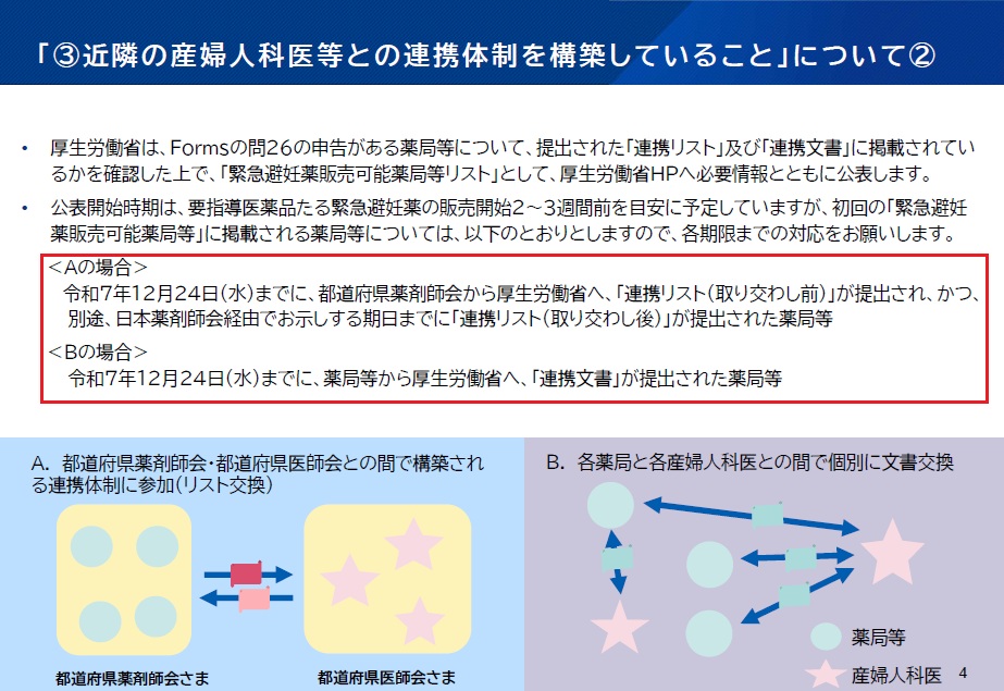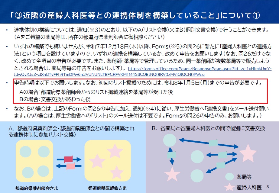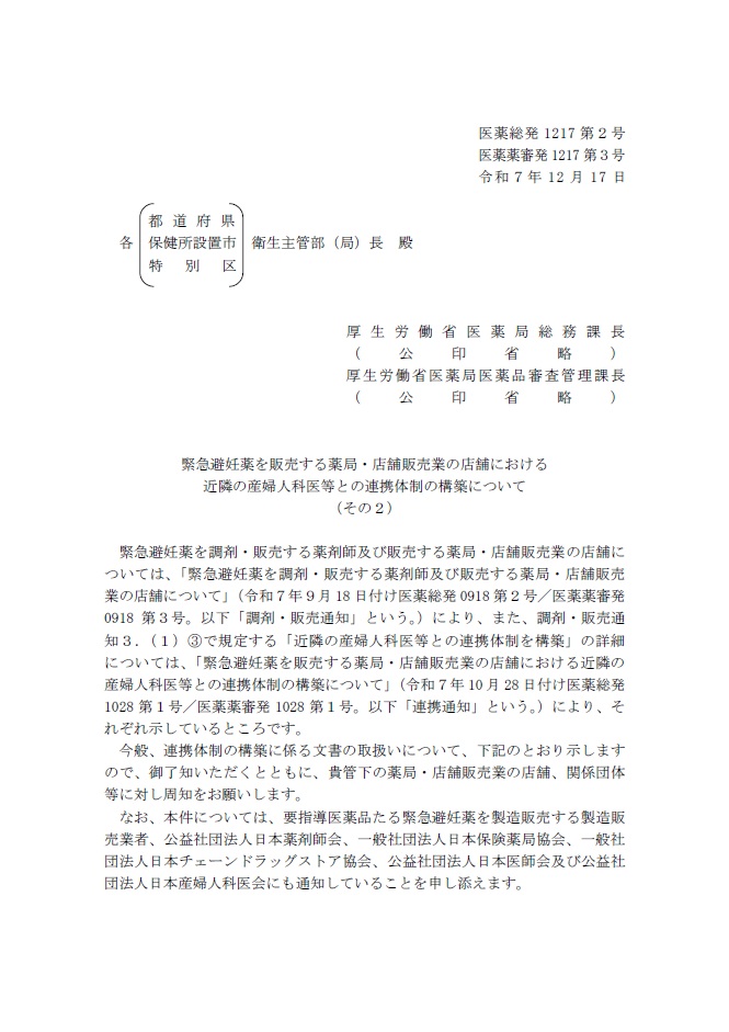 来年の2月からの販売が開始されるとされている要指導医薬品としての緊急避妊薬薬局ですが、半浴びにあたっては、近隣の産婦人科医等との連携体制についての申告が必要となっています。(→TOPICS 2025.10.28)