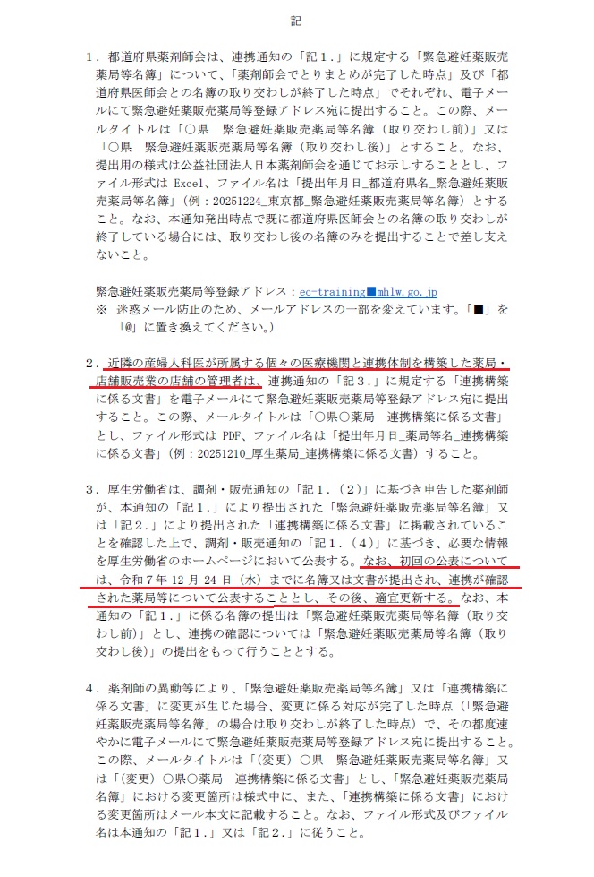 都道府県薬剤師会がとりまとめる「緊急避妊薬販売薬局等名簿」への掲載(→TOPICS 2025.12.06)を行なわず、地域薬剤師会ではなく、直接近隣の産婦人科医との連携の文書を取り交わした場合には、専用のアドレスへの提出が必要になります
