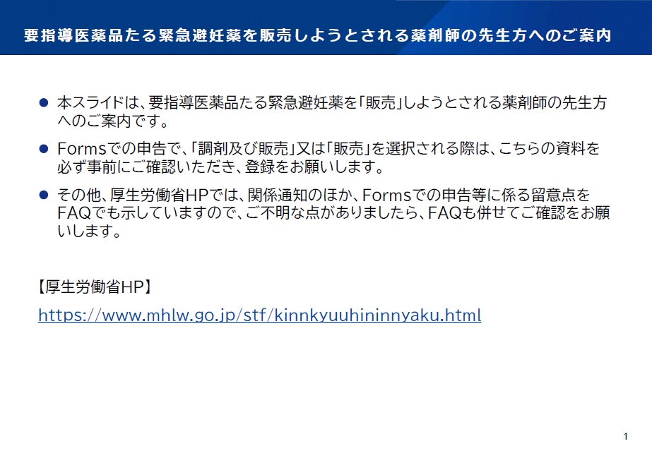 要指導医薬品たる緊急避妊薬を「販売」しようとされる薬剤師の方におかれましては、「近隣の産婦人科医等との連携体制」について、改めてFormsでの申告をお願いします