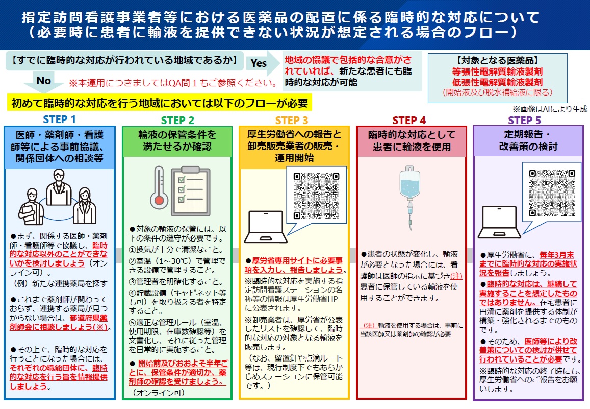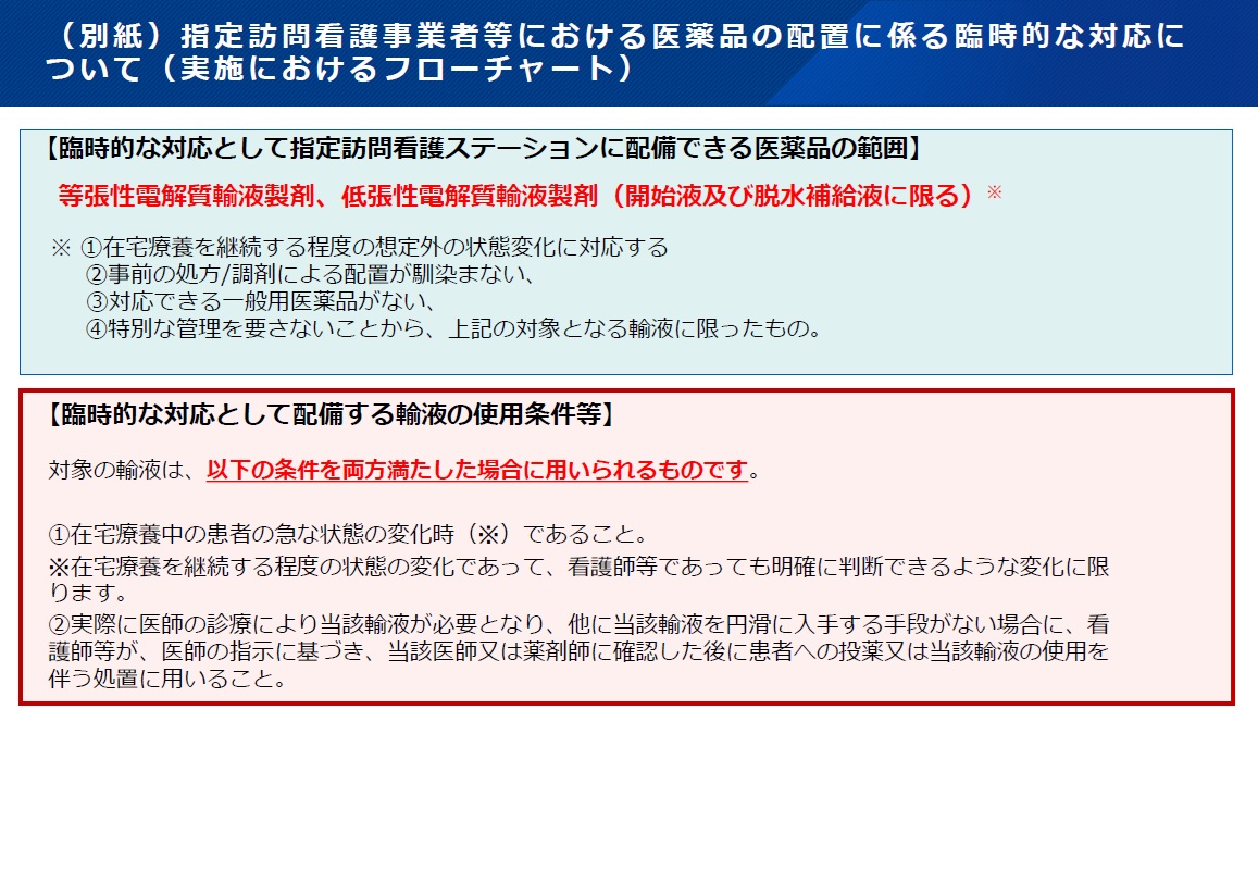 今回の措置について現場の看護師からは、夜間に高齢者が下痢や嘔吐で脱水症状時に往診医が「点滴が必要」と判断した際、訪問看護ステーションに在庫があれば、その場ですぐに点滴を開始できるなど、 深夜・休日の急な体調変化に迅速に対応できるようになるといった歓迎の声があります。