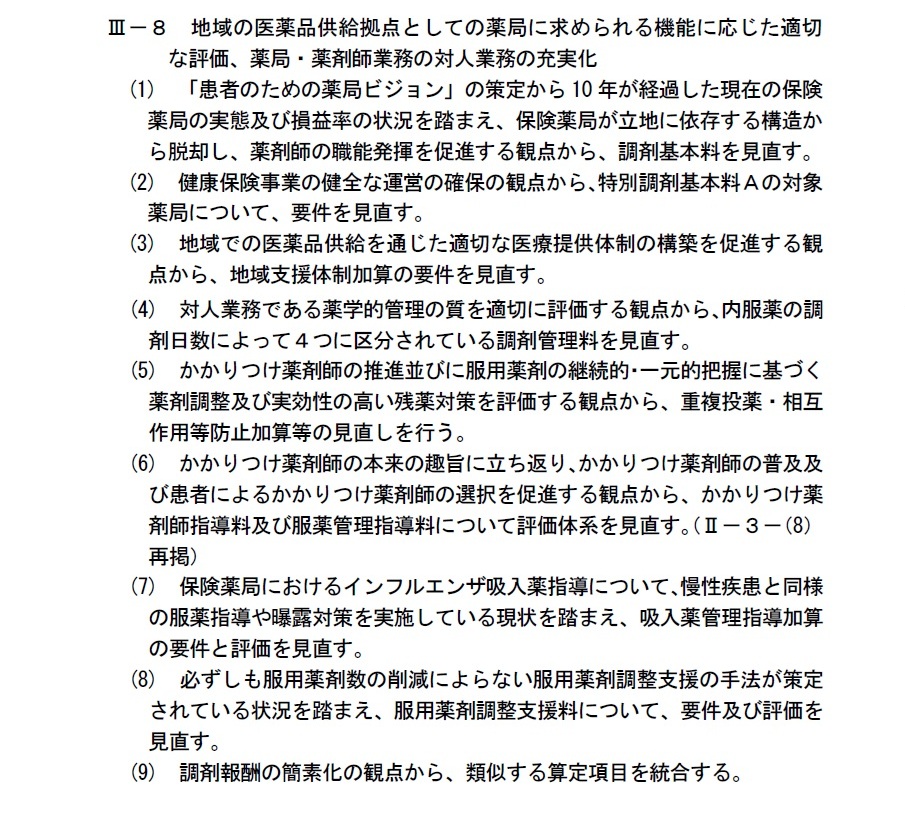 今回注目は、調剤基本料や地域支援体制加算、かかりつけ薬剤師指導料など調剤フィーの根幹に関わる部分について、要件や点数の見直しが行われることとなりそうなので、内容や配点によっては大きな影響がありそうです。
