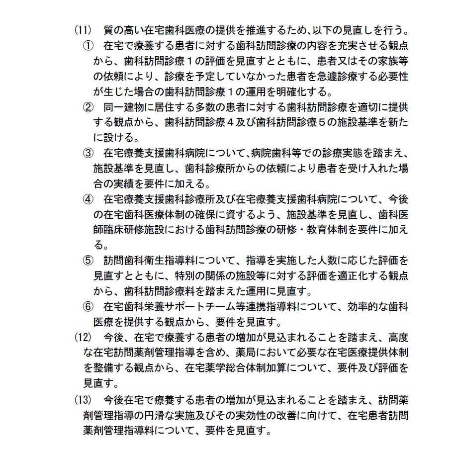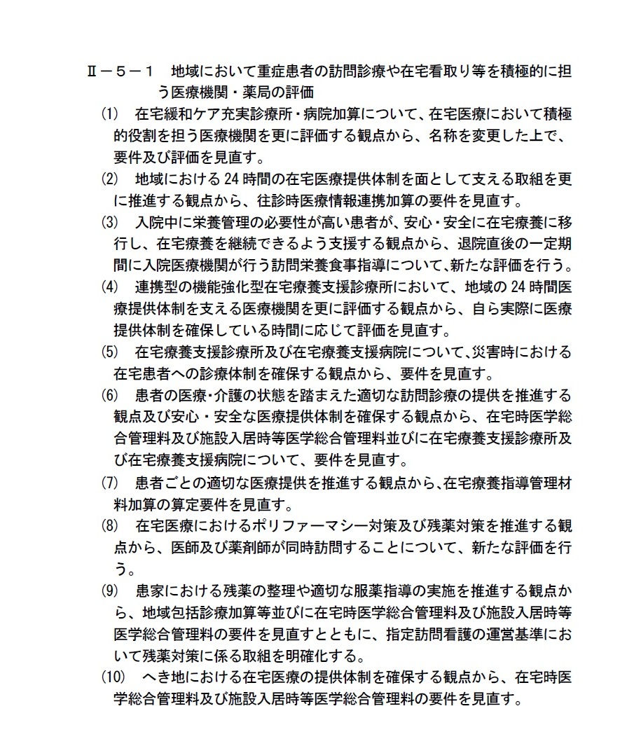 例年通りなら、さらにこれらに細かな項目が加えられ、今月末に算定要件などが示された「個別改定項目」(短冊)が提示、追加の議論を経て、2月中旬に点数が入った「答申」というスケジュールになります。(3月に説明会)