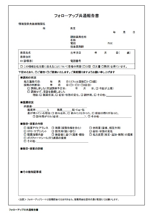 また、「来局した患者の心身の状態を網羅的に正確に評価し、継続して薬剤交付を行うか、あるいは受診勧奨するか、などについて患者状態を簡にして要を得た内容を処方医へ報告する必要がある」として、継続して薬剤交付する可否の結果に関する「フォローアップ報告書」が開発され、処方医への報告が求められたのです。