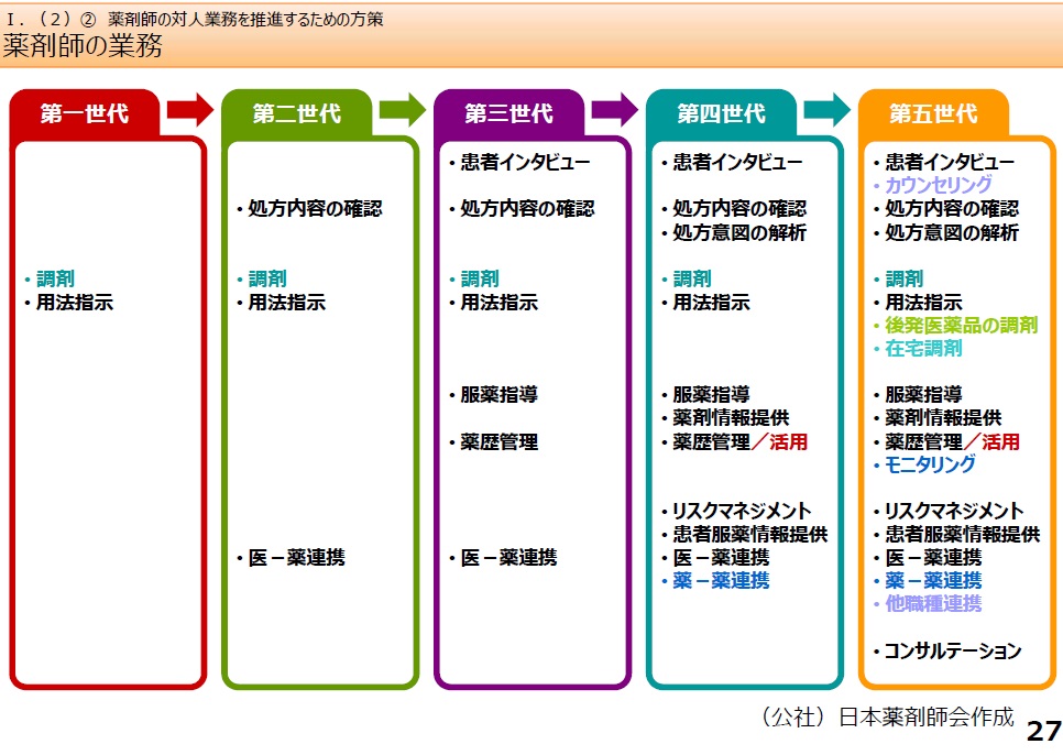 それから、27枚目の「薬剤師の業務」というところで「日本薬剤師会作成」というものがあります。それで、第一世代から第五世代というふうになっていますが、現在、薬剤師の業務は第何世代なのですか。