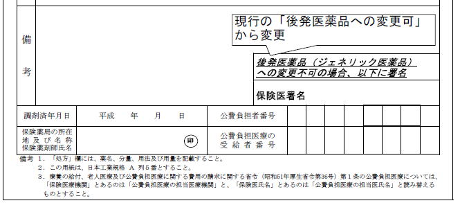 - 処方医が、処方せんに記載した先発医薬品を 後発医薬品に変更することに差し支えがあると判断した場合には、その旨の意思表示ができるよう、「後発医薬品への変更不可」欄(以下、変更不可欄に省略)に記名・押印する。