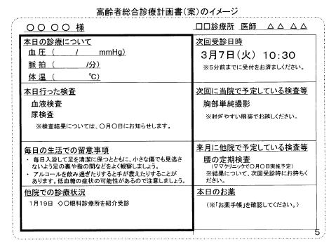 一方注目点としては、一人の医者が基本的な日常生活の能力や慢性疾患の病状等に加え、患者の病歴、受診歴や服薬状況、他の医療機関の受診状況等も把握するような仕組みが必要として、病名などの基本情報、計画的に実施する検査等を記した「高齢者総合計画書」というもののを患者ごとにつくることが検討されています。